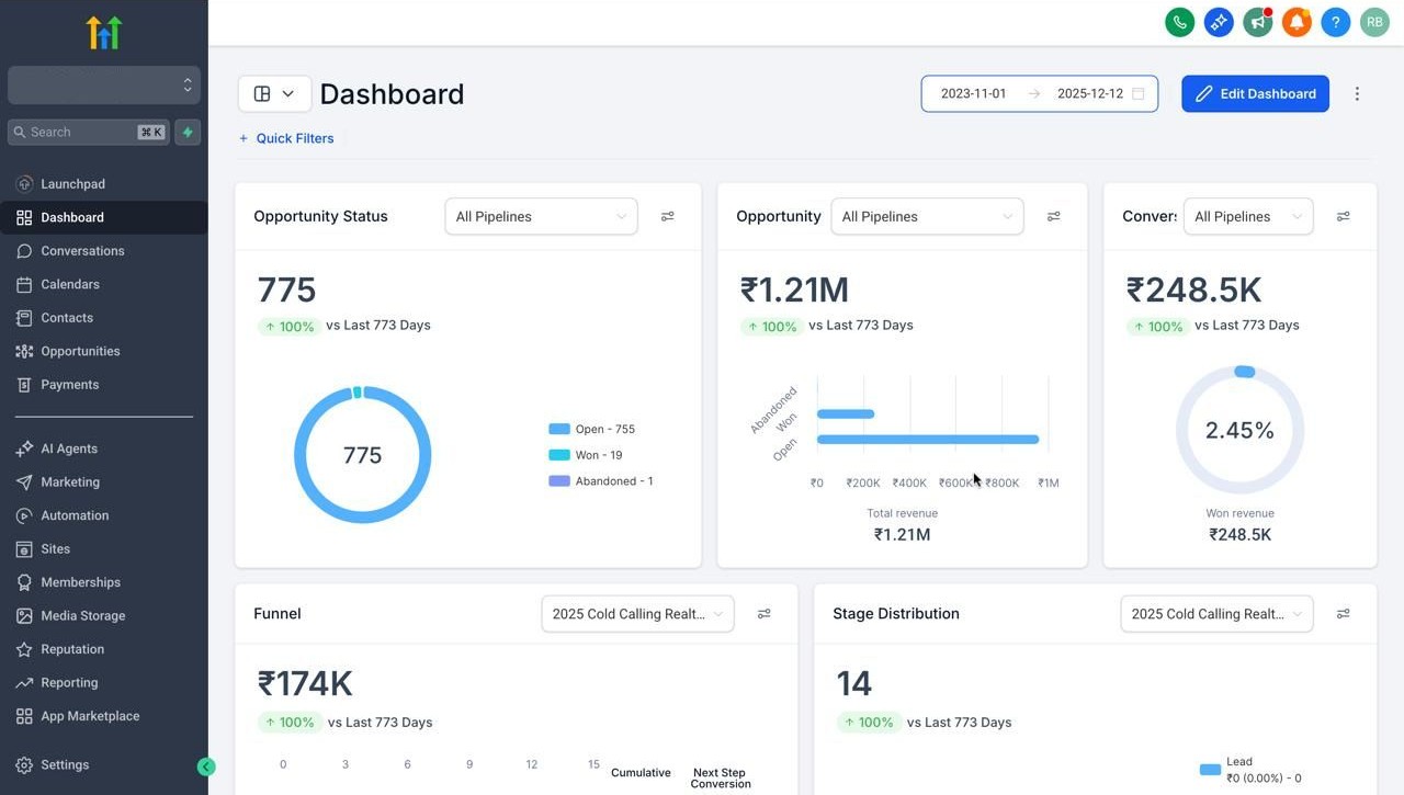 Build funnels, send emails, book appointments, host courses, track calls, manage your reputation — all from a single dashboard.